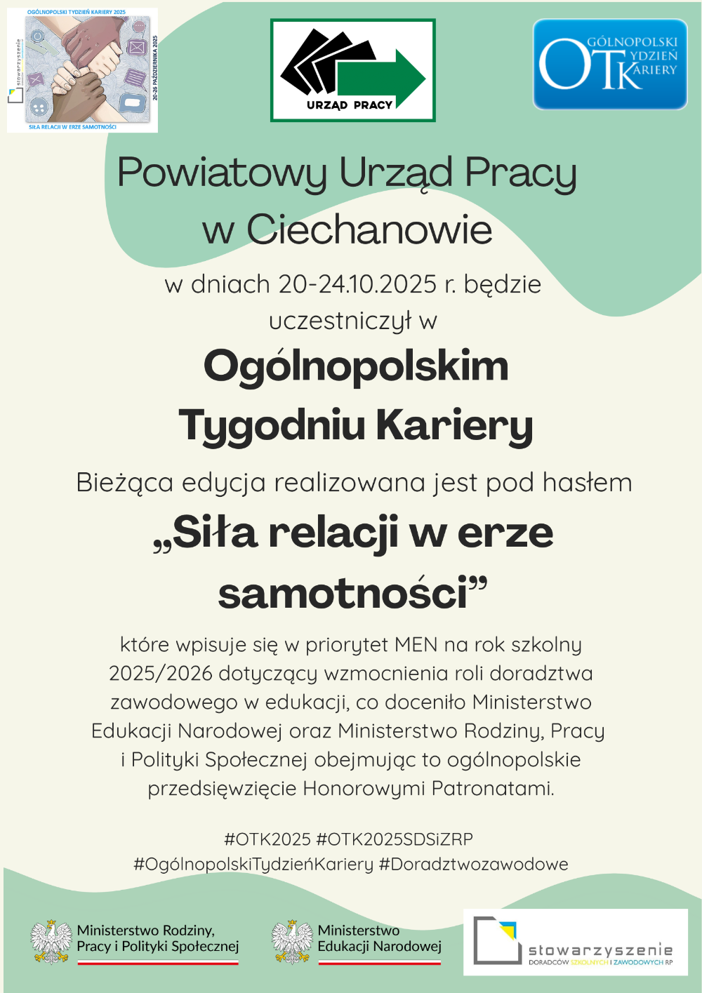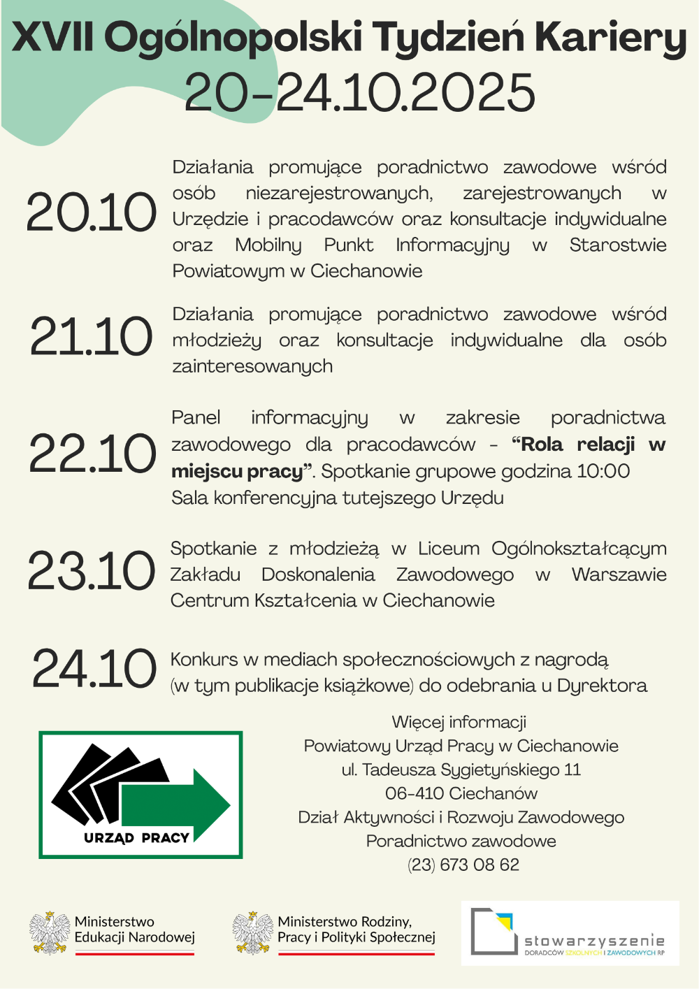 Powiatowy Urząd Pracy w Ciechanowie w dniach 20-24.10.2025 r. będzie uczestniczył w Ogólnopolskim Tygodniu Kariery.